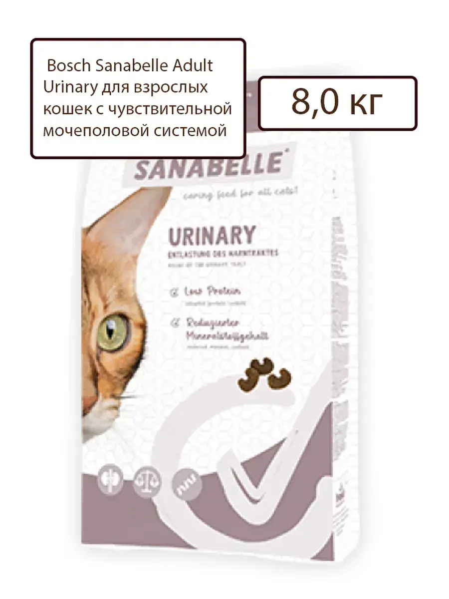 Bosch Adult Sanabelle Urinary — мягкое питание для чувствительных мочевыводящих путей кошек. Кошкам с чувствительными мочевыводящими путями требуется диета, которая специально облегчает и поддерживает их работу, обеспечивая при этом все необходимые питательные вещества. Корм Sanabelle Urinary разработан специально для взрослых кошек, склонных к проблемам с мочевыводящими путями, как после ветеринарного лечения, так и для долгосрочной профилактики.