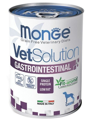 MONGE VETSOLUTION Dog GASTROINTESTINAL влажная диета для собак Гастроинтестинал 400 г.Легкоусвояемый корм для взрослых собак с повышенным содержанием натрия и калия и пониженным содержанием жира для устранения симптомов расстройства пищеварения. Содержит нуклеотиды для поддержки иммунной системы, конский каштан для здоровья кишечника, ксилоолигосахариды (X.O.S.) для защиты кишечной микробиоты.