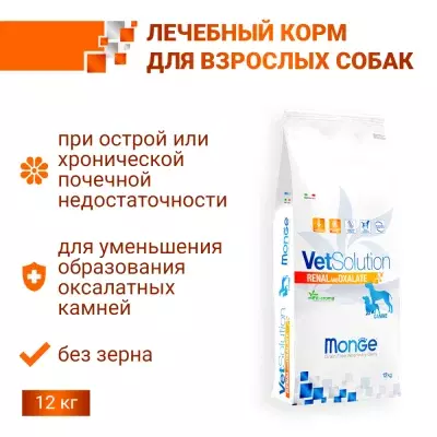 Беззерновая диета для собак MONGE GRAIN FREE VETSOLUTION RENAL CANINE содержит супероксиддисмутазу – для предотвращения оксидативного стресса, ксилоолигосахариды – для контроля кишечной микрофлоры, функциональную систему Fit-aroma® – для создания специального подход лечению почечной недостаточности у собак.